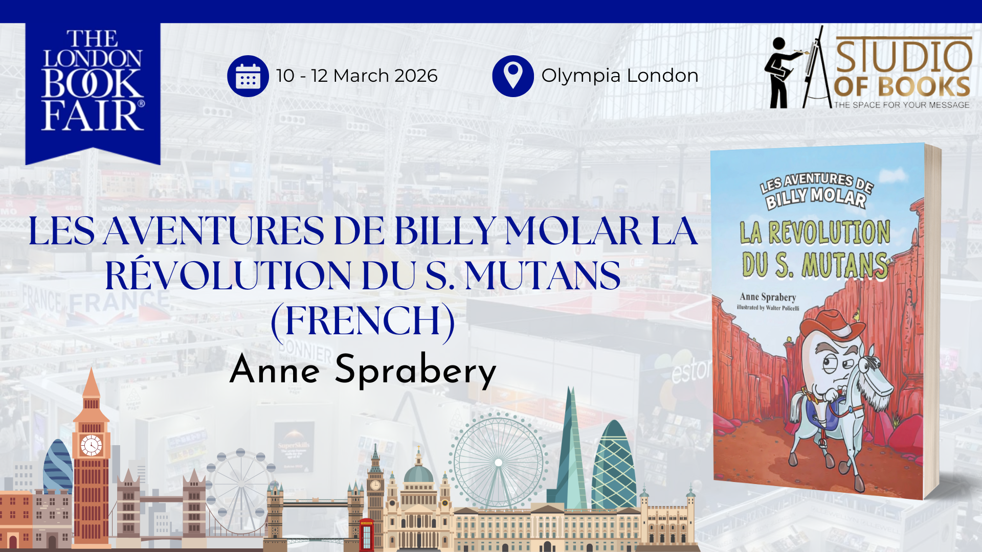 “Les Aventures de Billy Molar La révolution du S. Mutans (French)” by Anne Sprabery stepped onto the international stage at the 2026 London Book Fair, held 10–12 March at Olympia, London. This year, the book fair welcomed 1,005 exhibitors and more than 33,000 visitors.